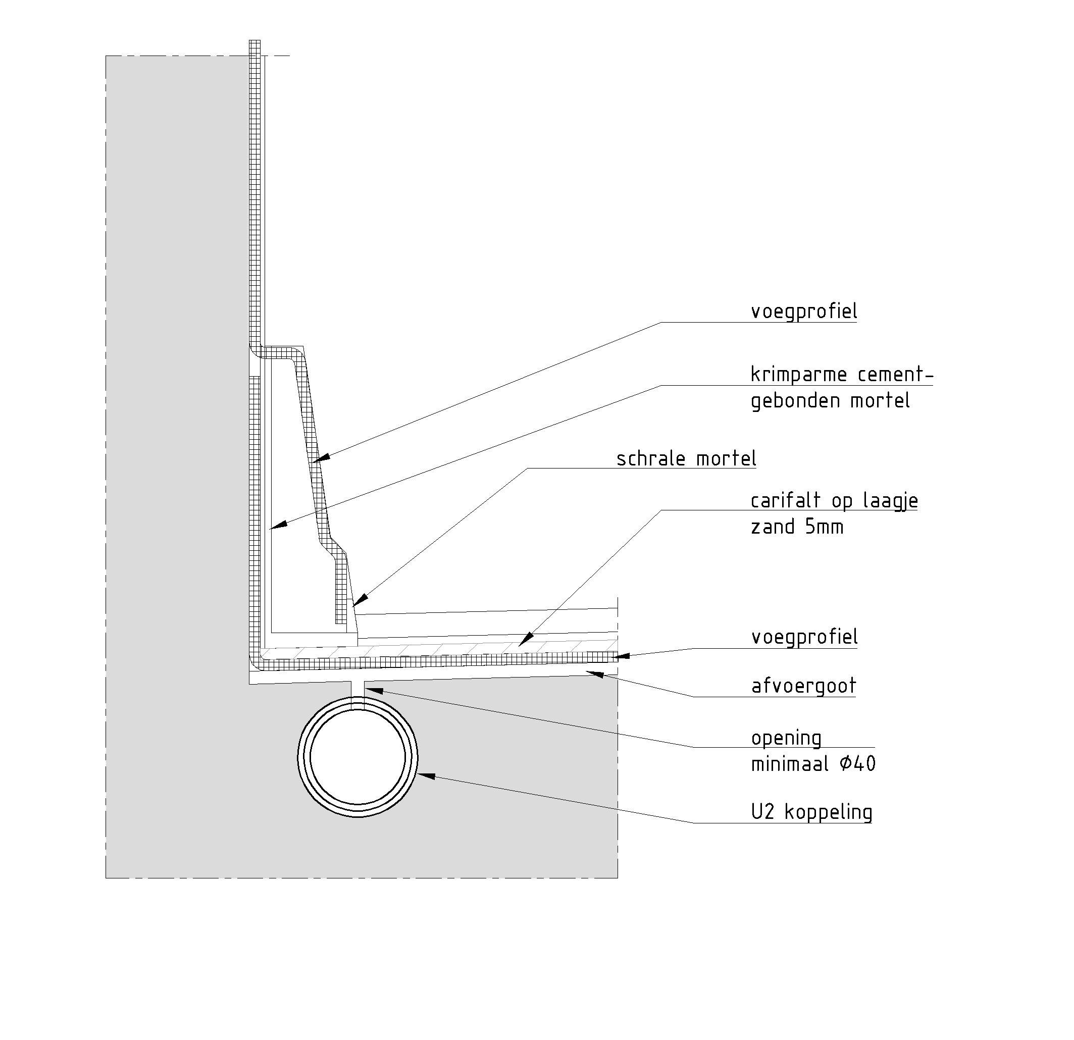 Het lekwater dat van buitenaf in de voeg komt wordt afgevoerd via de goot tussen asfalt en constructiebeton en een gat ø 40 mm naar de riolering. Het voegprofiel dient in de bouwfase zo snel mogelijk te worden aangebracht om indringing van vuil tegen te gaan.