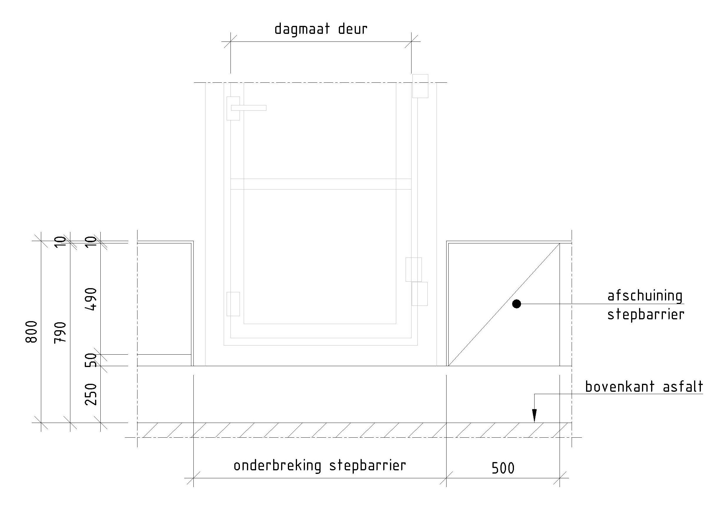Onderbreking in de geleidebarrier t.b.v. de toegang naar het middenkanaal. De onderbreking zodanig uitvoeren dat de geleidende functie zo goed mogelijk wordt gewaarborgd en dient in de eindsituatie minimaal 250 mm hoog te zijn.