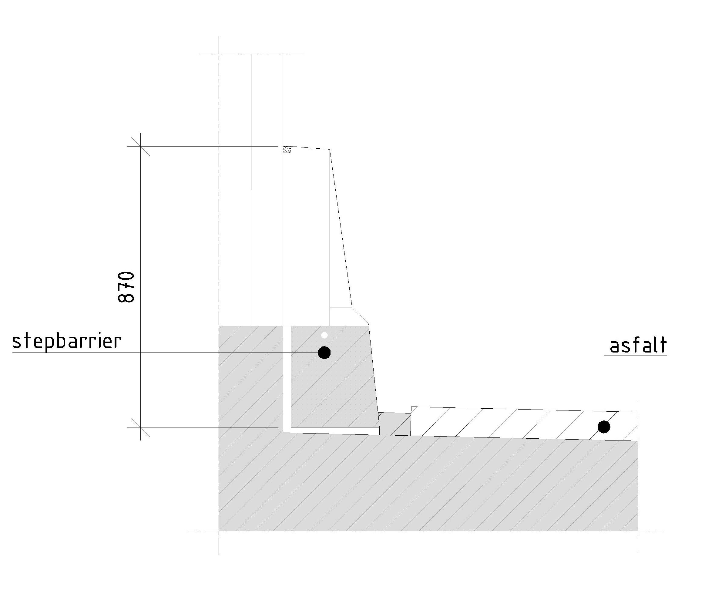 Het bovenvlak van de horizontale opstap afwaterend maken. De voeg tussen de geleidebarrier en de wand van de horizontale opstap waterdicht afsluiten met een rubberhoudende elastisch blijvende bitumineuze voegvulling (zie detailontwerp figuur 455.2).