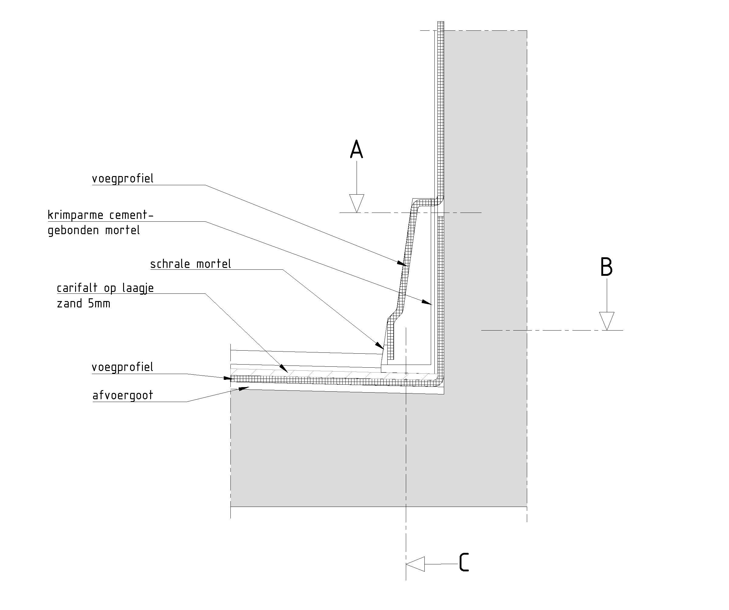 Tussen de beide step barriers wordt een voeg opengehouden van 30 mm. De voorkant van deze voeg wordt afgedicht met een voegprofiel. Ter plaatse van het asfalt wordt het voegprofiel beschermd d.m.v. een laag schrale mortel.