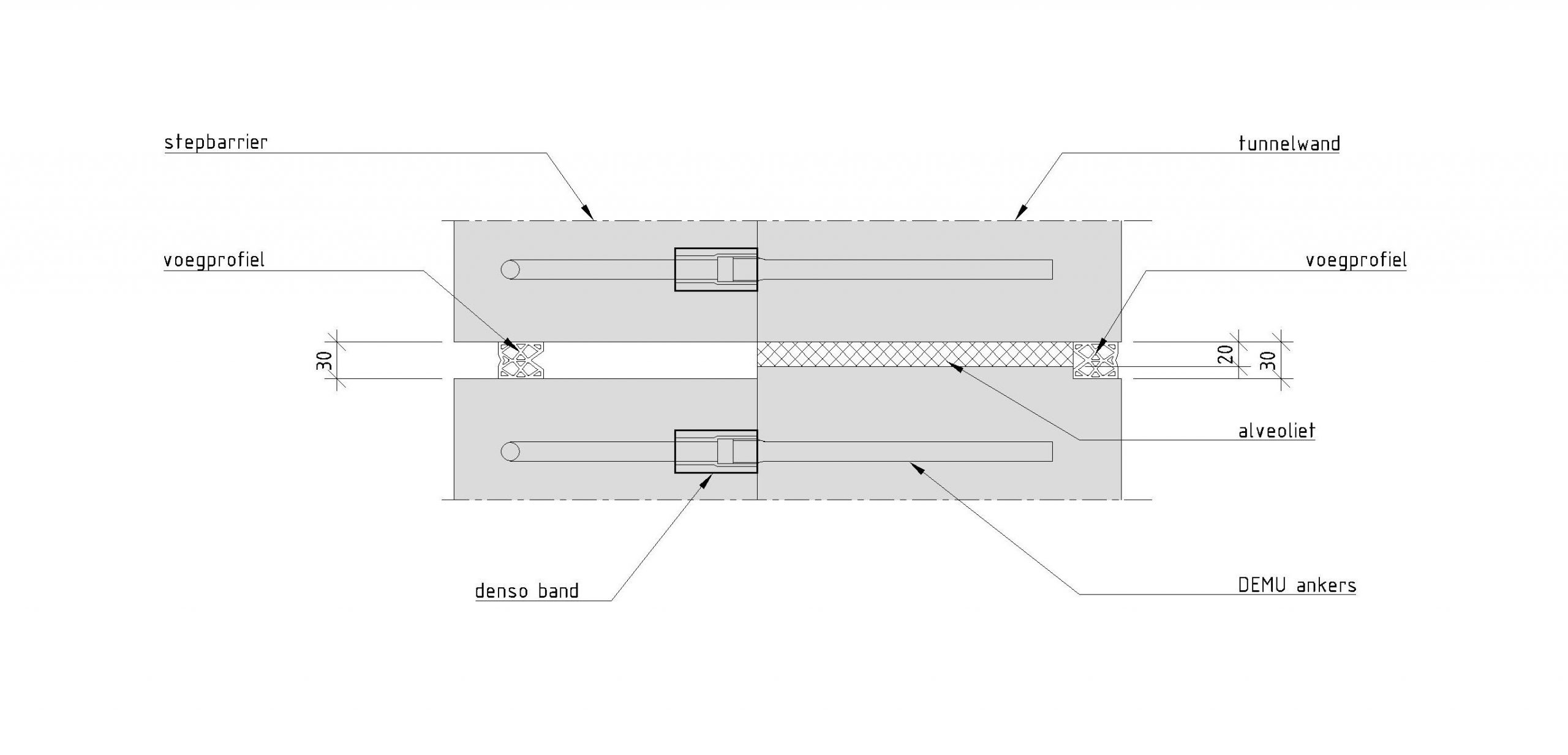 Tussen de beide step barriers wordt een voeg opengehouden van 30 mm. Het voegprofiel loopt in één keer door over de totale constructie.