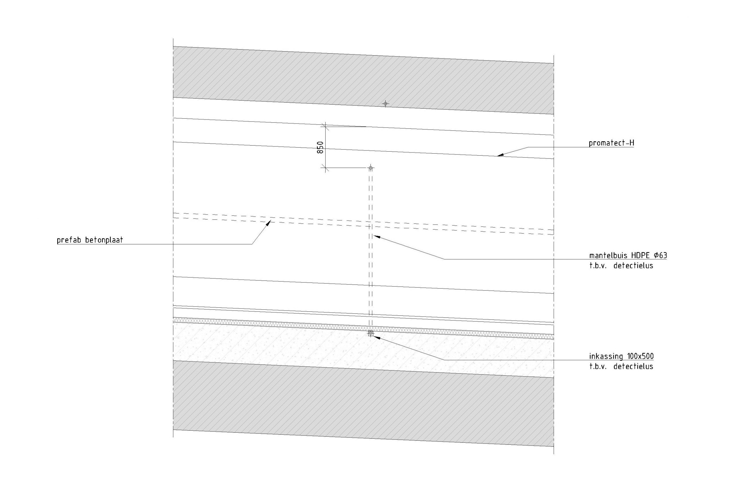 Voor het aanbrengen van de bekabeling naar de detectielussen in het wegdek wordt een sparing 100x150x500 mm aangebracht. Van hier af wordt een PE-HD- buis Ø 63×55,8 mm ingestort door de middenwand naar het middentunnelkanaal. De plaatsing van de buizen relateren aan plaatsing van de lussen in het wegdek.