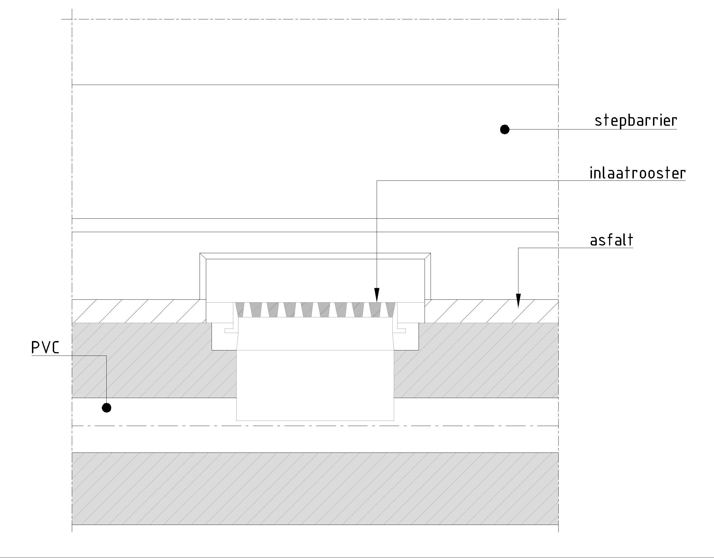 Op de rioleringsbuis wordt een bekisting aangebracht t.b.v. de sparing van het inlaatrooster. Na het storten van het beton wordt het inlaatrooster geplaatst en aangestort met krimparme cementgebonden mortel. De barrier wordt ter plaatse van de inlaatroosters voorzien van een sparing. Het inlaatrooster wordt in dwarsrichting ten minste 100 mm onder de barrier geplaatst. De bovenkant van het inlaatrooster wordt 20 mm onder bovenkant asfalt gesteld. De roosters zijn van het type TBS STR 890 (belastingklasse volgens EN124 en BRL 9203) gekneveld; zwaar verkeer. Om te voorkomen dat water onder de barriers komt moeten de kopse kanten onder de barriers worden dichtgezet met bijvoorbeeld thormaseal.