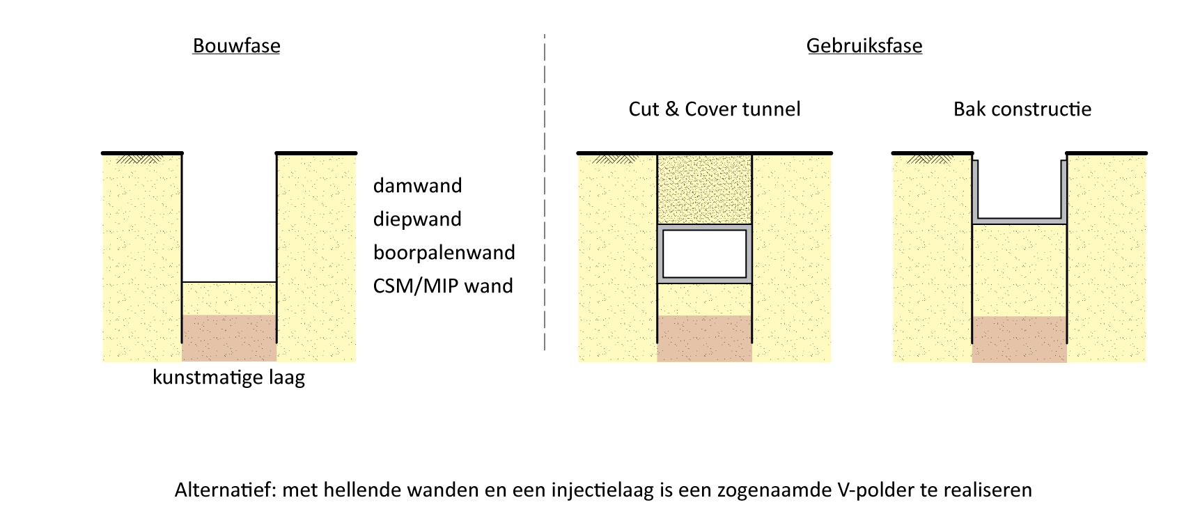 • Polderconstructie: Dit is een constructie met een in de grond aangebrachte kuip- of bakvormige waterdichte laag, waardoor het mogelijk is om binnen de bak of kuip het grondwaterpeil en het maaiveld permanent te verlagen. Eventueel worden natuurlijke in de bodem aanwezige waterdichte lagen, bijvoorbeeld potklei, als afsluitende laag gebruikt en in de constructie opgenomen. Varianten van polderconstructies zijn:
