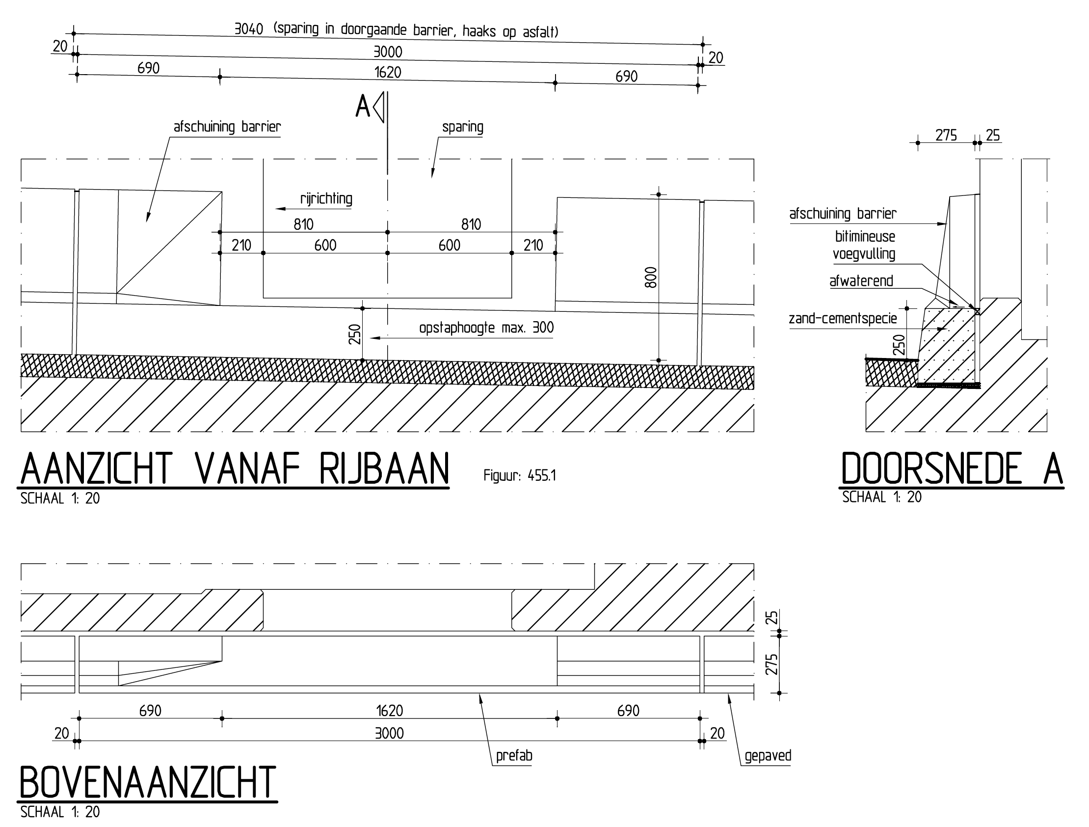 Het bovenvlak van de horizontale opstap moet afwaterend worden gemaakt. De voeg tussen de geleidebarrier en de wand van de horizontale opstap worden waterdicht afgesloten met een rubberhoudende elastisch blijvende bitumineuze voegvulling (zie detailontwerp figuur 455.1 en figuur 455.2).