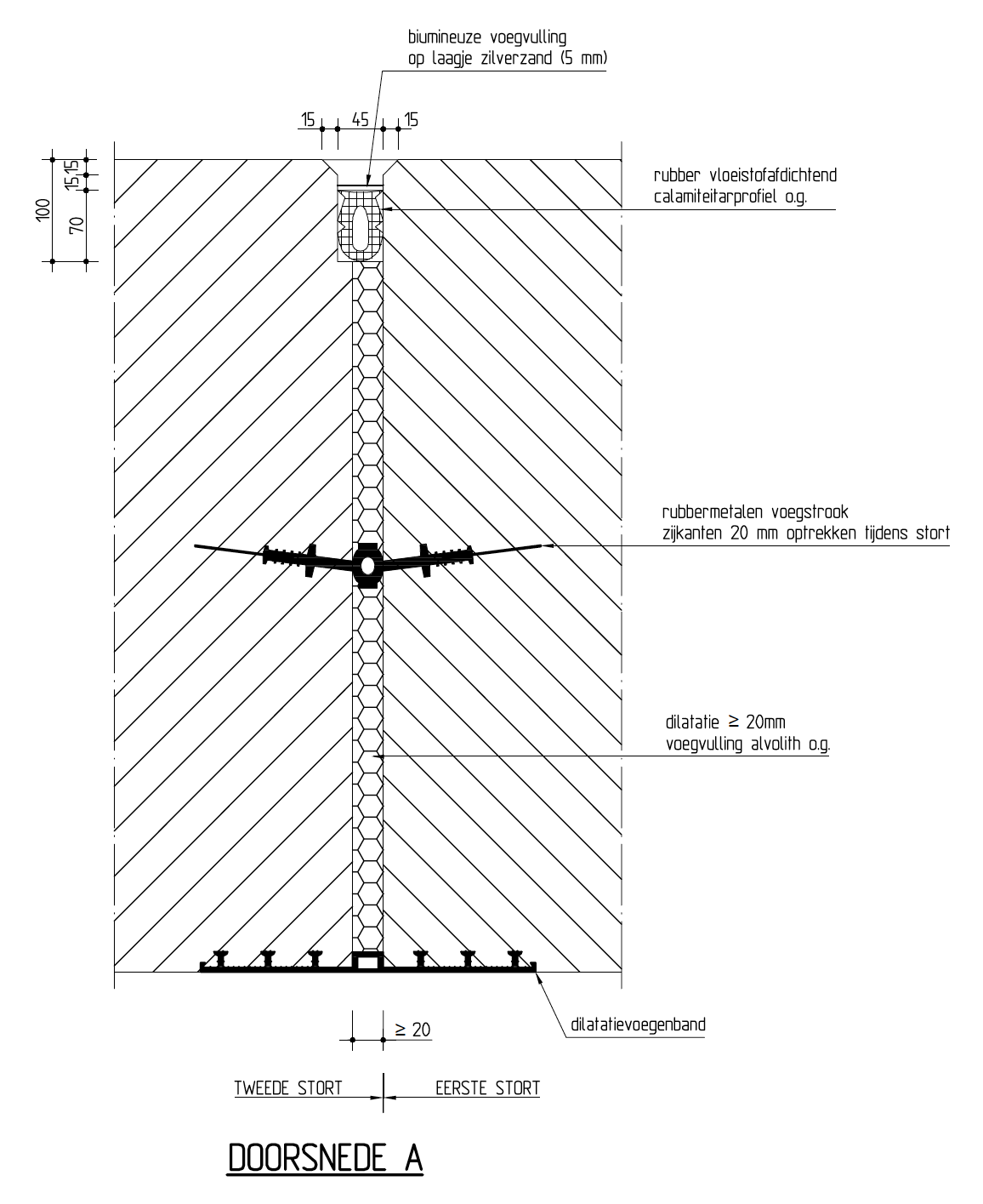 Als calamiteitenafdichting en om hechting van de overlaging aan de flexibele afdichting te voorkomen wordt de ruimte boven de afdichting met bitumineuze voegvulling (zoals carifalt) ingegoten (zie figuur 265.1). Ook deze voegvulling dient niet aan het afdichtingsprofiel te hechten, daartoe wordt een laagje (zilver)zand op de afdichting geplaatst alvorens het in te gieten. Onder het rubber afdichtingsprofiel dient gootruimte aanwezig te zijn, zoals in figuur 269.1 is weergegeven