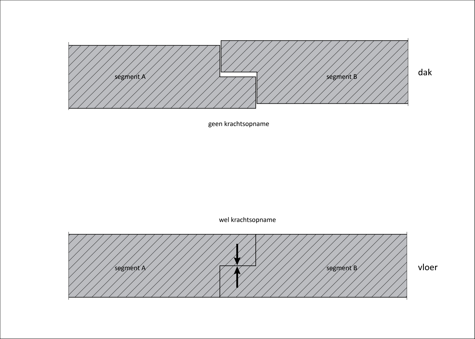 Als tussen twee aansluitende tunnelelementen verschil in zetting kan ontstaan, moet het constructief ontwerp zodanig zijn dat geen schade kan optreden. figuur 84.1 geeft het geval weer dat door zetting van tunnelsegment A schade ontstaat aan tunnelsegment B. De tandoplegging van het segment wordt extra belast waardoor deze kan afscheuren, zie figuur 84.2.