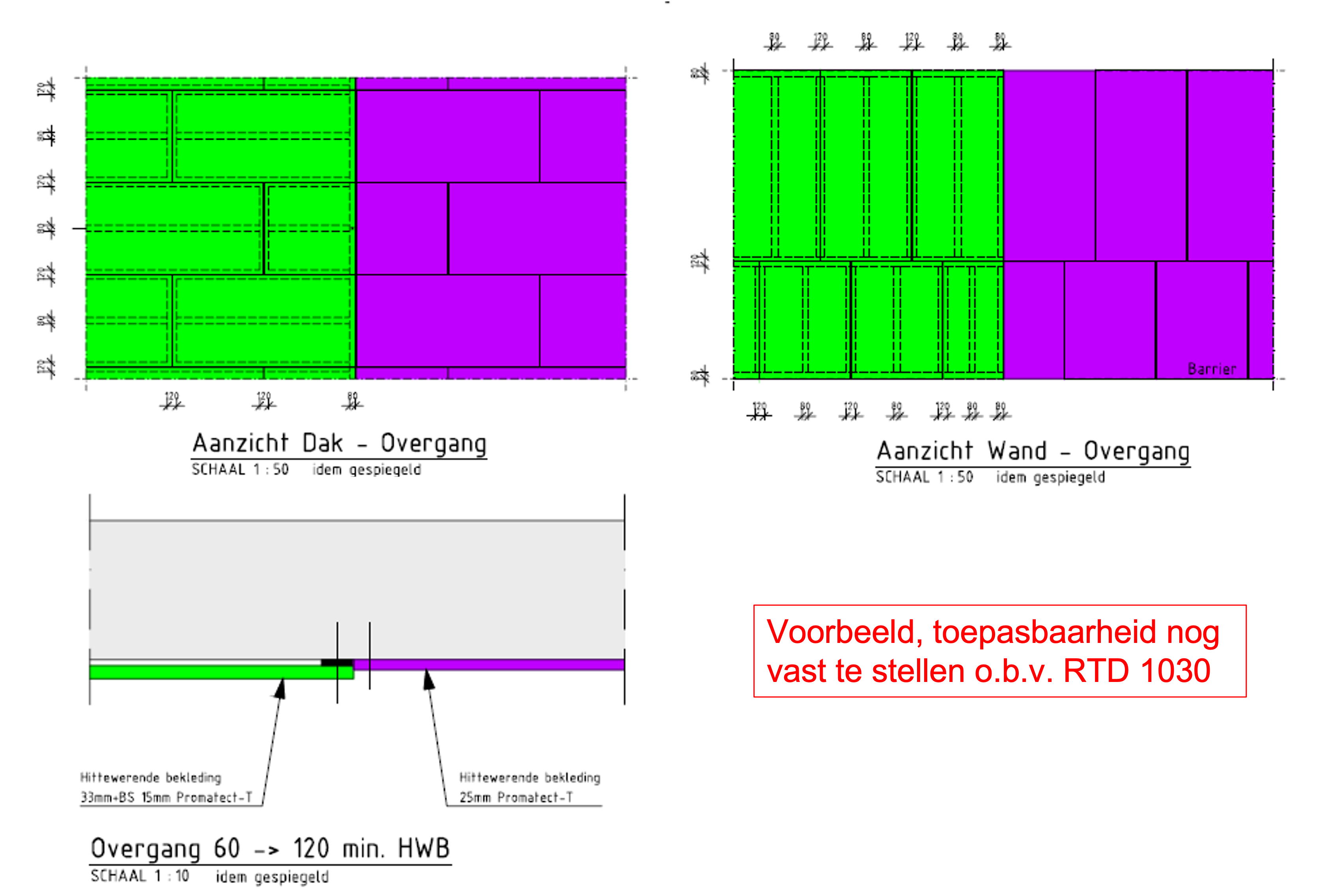 Figuur 498.8 – Wand en dak t.p.v de overgang van 60 naar 120 min. brandwerendheid